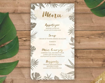 Tropical Menu Table cards Tropical Leaves Palm Leaf Greenery Travel Theme Invitation Set by Luckyladypaper